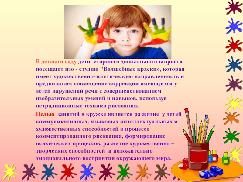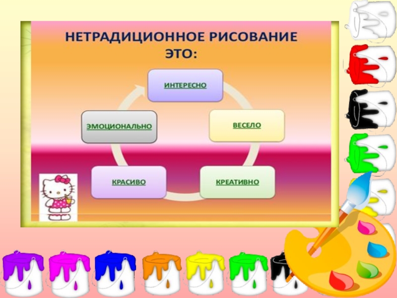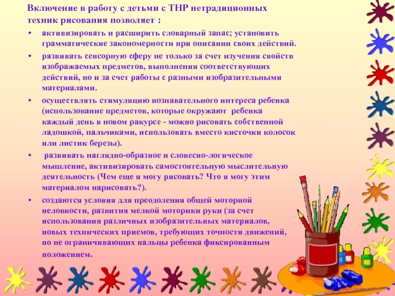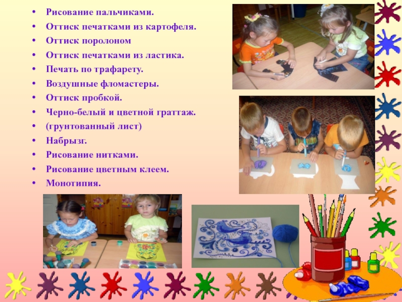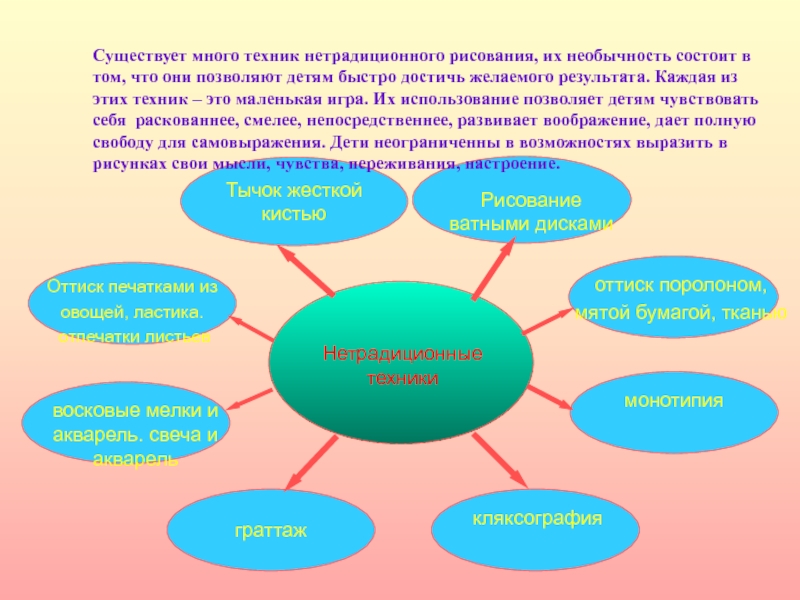 Существует много техник нетрадиционного рисования, их необычность состоит в том, что они позволяют детям быстро достичь желаемого результата. Каждая из этих техник – это маленькая игра. Их использование позволяет детям чувствовать себя раскованнее, смелее, непосредственнее, развивает воображение, дает полную свободу для самовыражения. Дети неограниченны в возможностях выразить в рисунках свои мысли, чувства, переживания, настроение.