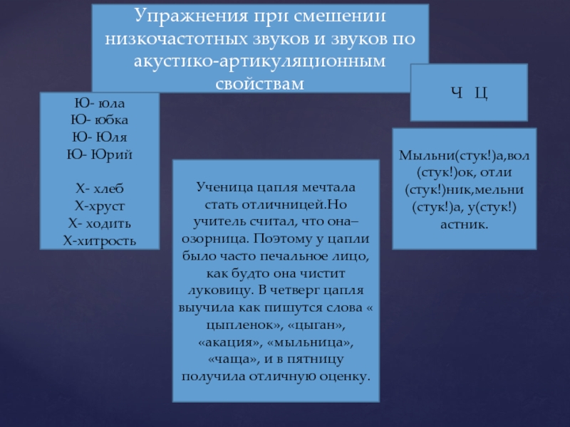 Ученица цапля мечтала стать отличницей.Но учитель считал, что она– озорница. Поэтому у цапли было часто печальное лицо, как будто она чистит луковицу. В четверг цапля выучила как пишутся слова « цыпленок», «цыган», «акация», «мыльница», «чаща», и в пятницу получила отличную оценку.