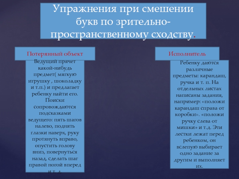 Ребенку даются различные предметы: карандаш, ручка и т. п. На отдельных листах написаны задания, например: «положи карандаш справа от коробки». «положи ручку слева от мишки» и т.д. Эти лестки лежат перед ребенком, он вслепую выбирает одно задание за другим и выполняет их.