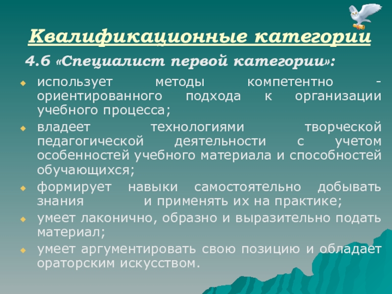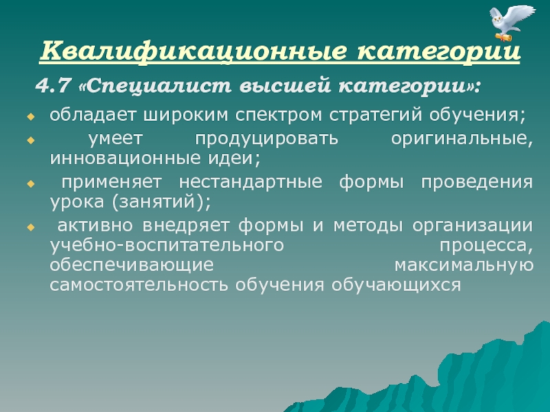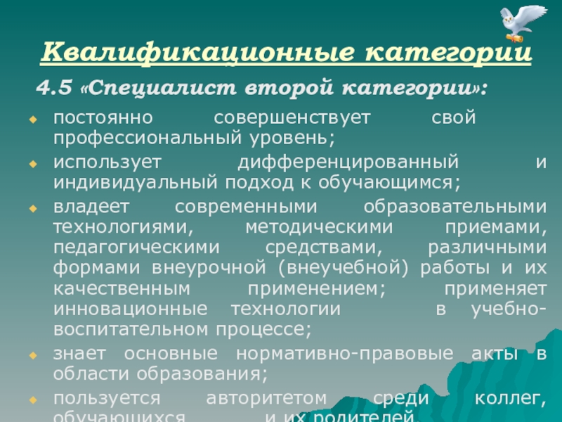 В своей работе использовать все формы и методы работы с обучающимися, в соответствии с требованиями данной квалификационной категории.