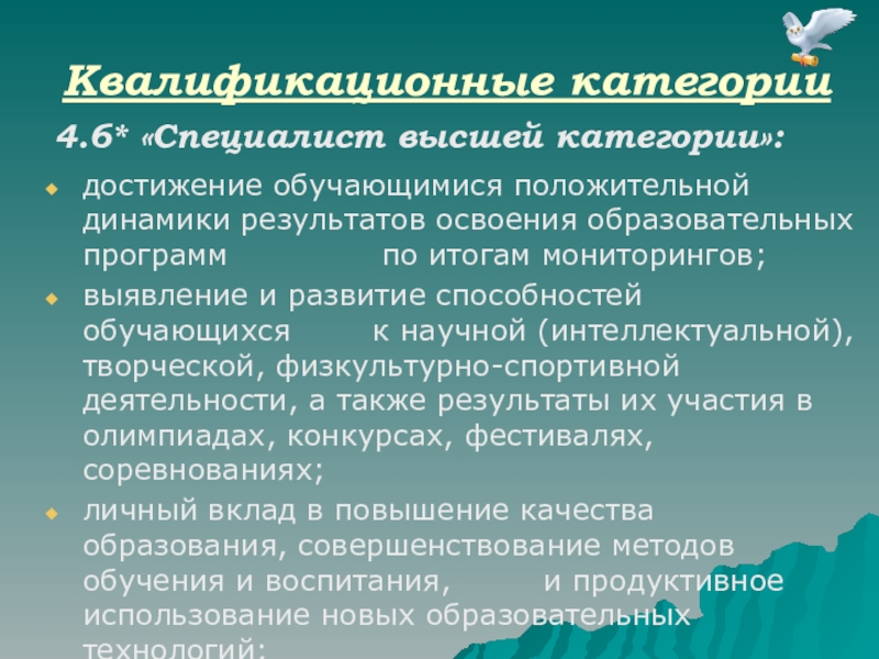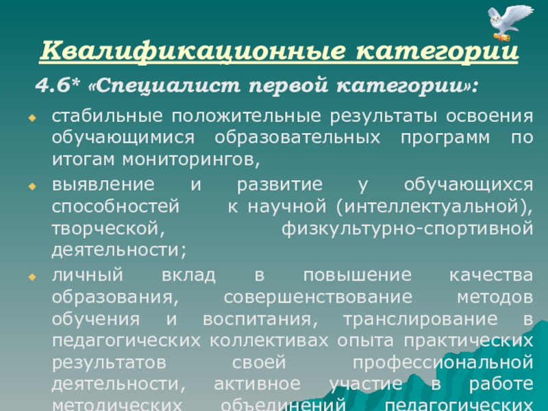 личный вклад в повышение качества образования, совершенствование методов обучения и воспитания, транслирование в педагогических коллективах опыта практических результатов своей профессиональной деятельности, активное участие в работе методических объединений педагогических работников.