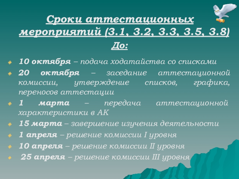 Слайд 24Сроки аттестационных мероприятий (3.1, 3.2, 3.3, 3.5, 3.8)