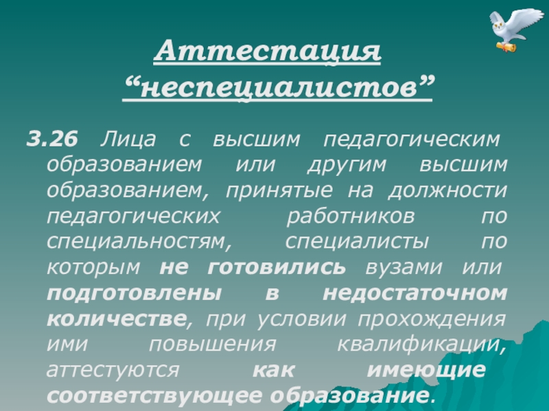принятые на должности педагогических работников по специальностям, специалисты по которым не готовились вузами или подготовлены в недостаточном количестве, при условии прохождения ими повышения квалификации, аттестуются как имеющие соответствующее образование.