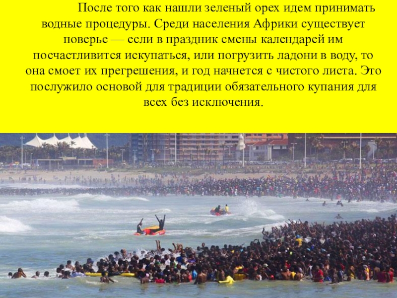 После того как нашли зеленый орех идем принимать водные процедуры. Среди населения Африки существует поверье — если в праздник смены календарей им посчастливится искупаться, или погрузить ладони в воду, то она смоет их прегрешения, и год начнется с чистого листа. Это послужило основой для традиции обязательного купания для всех без исключения.