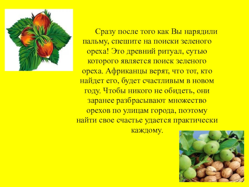 после того как Вы нарядили пальму, спешите на поиски зеленого ореха! Это древний ритуал, сутью которого является поиск зеленого ореха. Африканцы верят, что тот, кто найдет его, будет счастливым в новом году. Чтобы никого не обидеть, они заранее разбрасывают множество орехов по улицам города, поэтому найти свое счастье удается практически каждому.