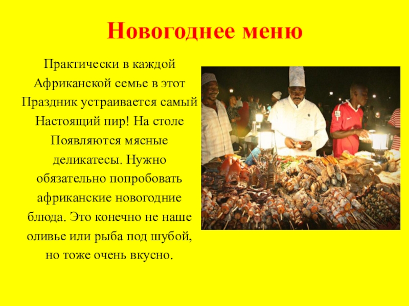 Новогоднее менюПрактически в каждойАфриканской семье в этотПраздник устраивается самыйНастоящий пир! На столеПоявляются мясныеделикатесы. Нужнообязательно попробоватьафриканские новогодниеблюда. Это