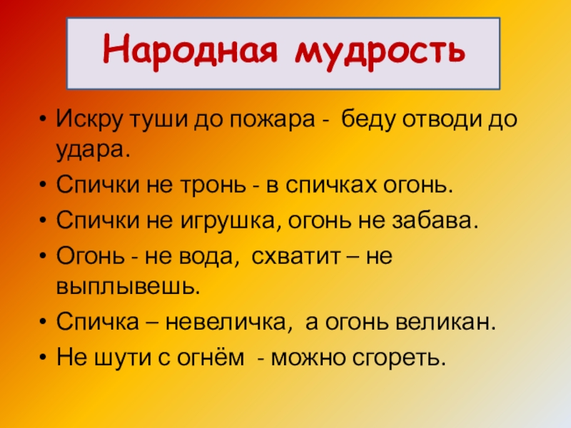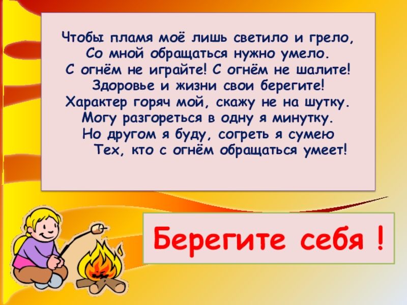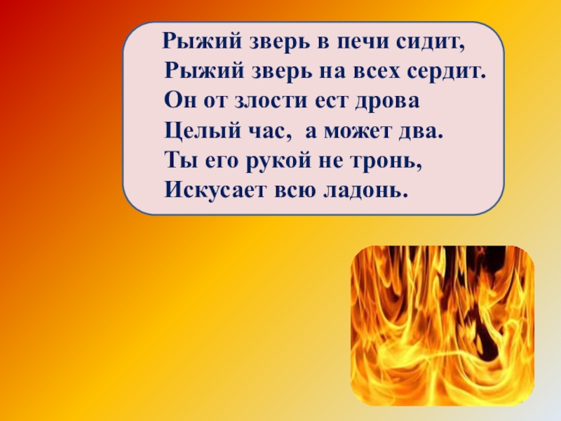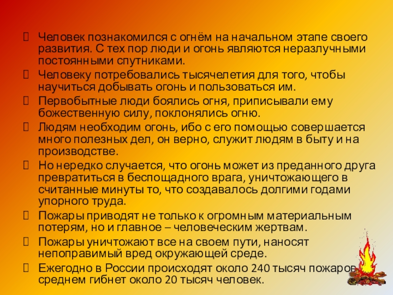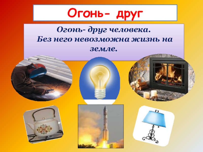 Людям необходим огонь, ибо с его помощью совершается много полезных дел, он верно, служит людям в быту и на производстве.