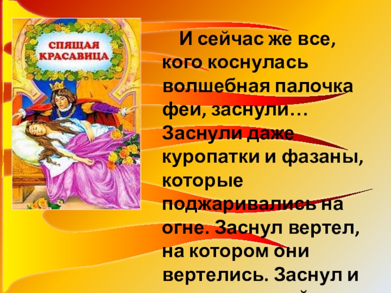 палочка феи, заснули… Заснули даже куропатки и фазаны, которые поджаривались на огне. Заснул вертел, на котором они вертелись. Заснул и огонь, который их поджаривал.