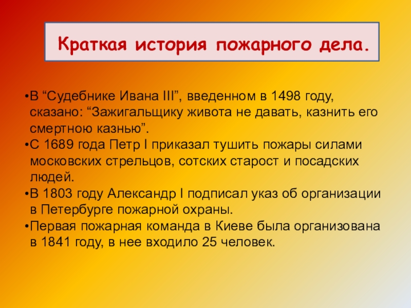 1498 году, сказано: “Зажигальщику живота не давать, казнить его смертною казнью”.