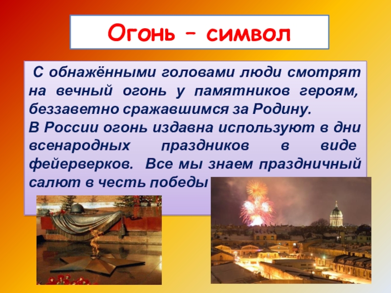 В России огонь издавна используют в дни всенародных праздников в виде фейерверков. Все мы знаем праздничный салют в честь победы 9 мая.