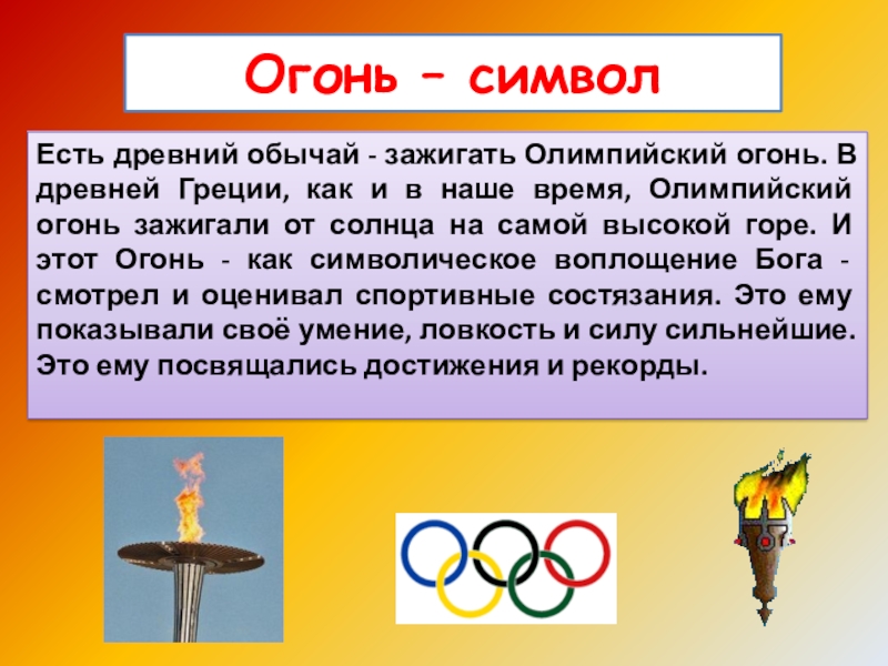 древней Греции, как и в наше время, Олимпийский огонь зажигали от солнца на самой высокой горе. И этот Огонь - как символическое воплощение Бога - смотрел и оценивал спортивные состязания. Это ему показывали своё умение, ловкость и силу сильнейшие. Это ему посвящались достижения и рекорды.