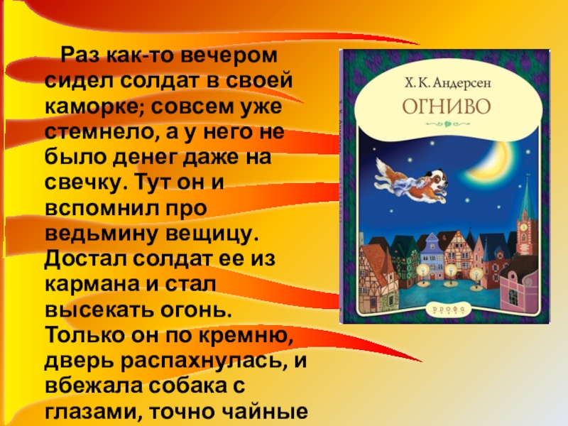 каморке; совсем уже стемнело, а у него не было денег даже на свечку. Тут он и вспомнил про ведьмину вещицу. Достал солдат ее из кармана и стал высекать огонь. Только он по кремню, дверь распахнулась, и вбежала собака с глазами, точно чайные блюдца…