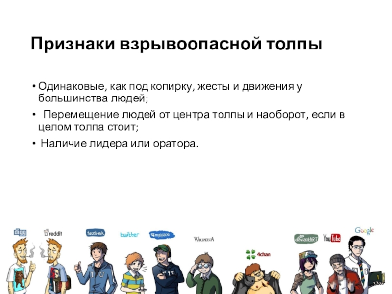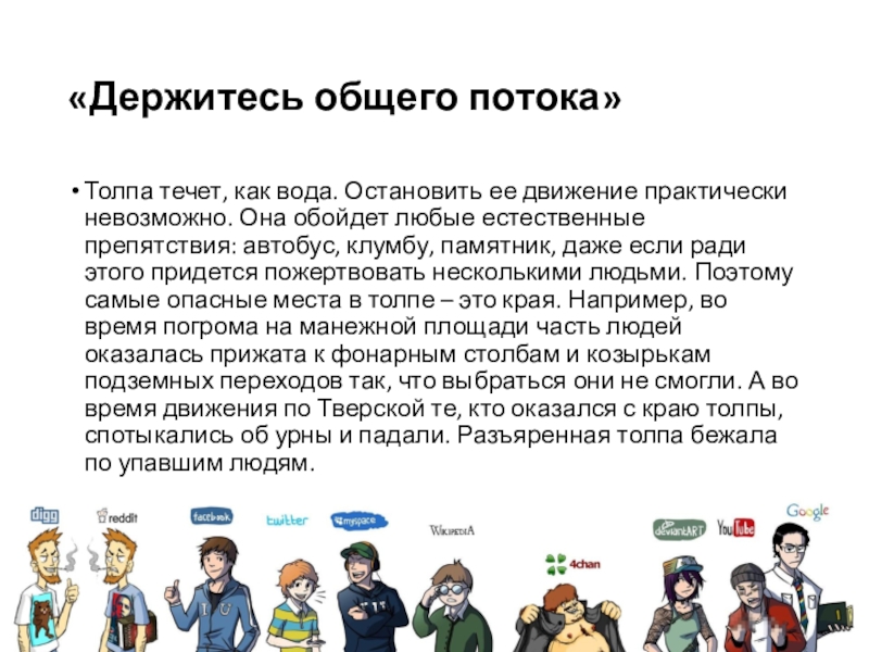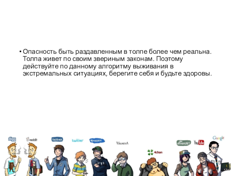 Слайд 9Опасность быть раздавленным в толпе более чем реальна. Толпа живет по