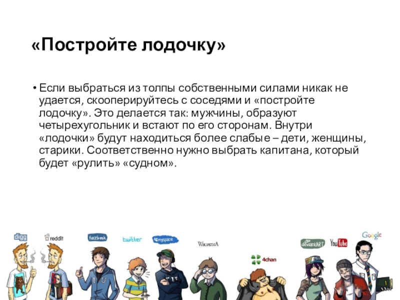 с соседями и «постройте лодочку». Это делается так: мужчины, образуют четырехугольник и встают по его сторонам. Внутри «лодочки» будут находиться более слабые – дети, женщины, старики. Соответственно нужно выбрать капитана, который будет «рулить» «судном».