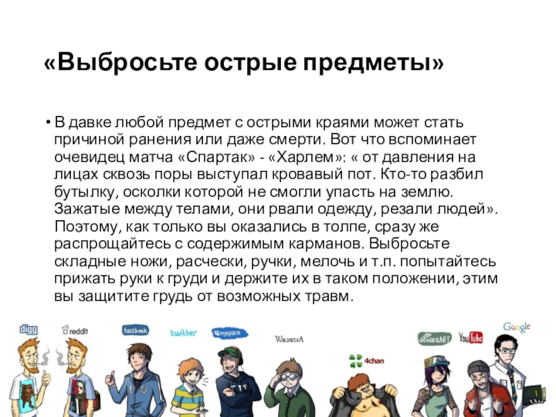 причиной ранения или даже смерти. Вот что вспоминает очевидец матча «Спартак» - «Харлем»: « от давления на лицах сквозь поры выступал кровавый пот. Кто-то разбил бутылку, осколки которой не смогли упасть на землю. Зажатые между телами, они рвали одежду, резали людей». Поэтому, как только вы оказались в толпе, сразу же распрощайтесь с содержимым карманов. Выбросьте складные ножи, расчески, ручки, мелочь и т.п. попытайтесь прижать руки к груди и держите их в таком положении, этим вы защитите грудь от возможных травм.
