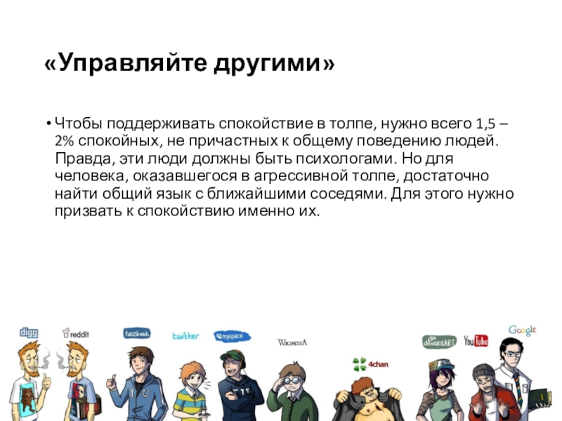 спокойных, не причастных к общему поведению людей. Правда, эти люди должны быть психологами. Но для человека, оказавшегося в агрессивной толпе, достаточно найти общий язык с ближайшими соседями. Для этого нужно призвать к спокойствию именно их.