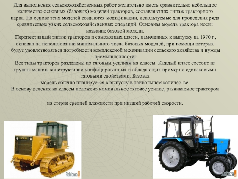Для выполнения сельскохозяйственных работ желательно иметь сравнительно небольшое количество основных (базовых) моделей тракторов, составляющих типаж тракторного парка.