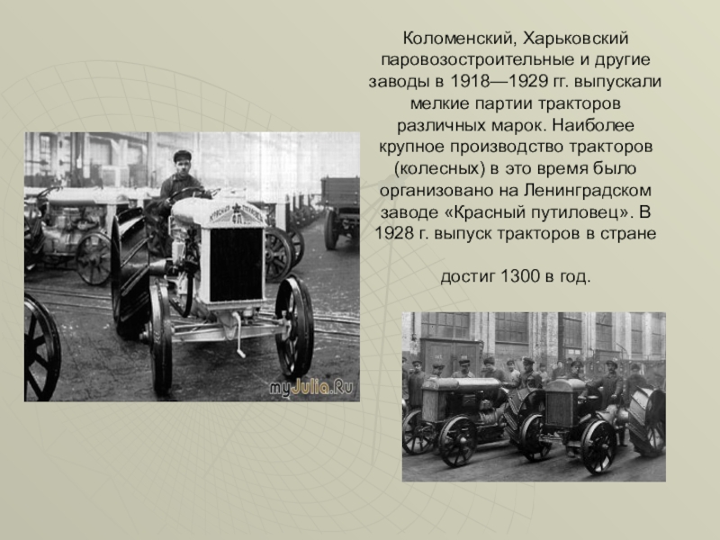 Коломенский, Харьковский паровозостроительные и другие заводы в 1918—1929 гг. выпускали мелкие партии тракторов различных марок. Наиболее крупное