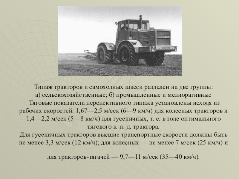 б) промышленные и мелиоративные Тяговые показатели перспективного типажа установлены исходя из рабочих скоростей: 1,67—2,5 м/сек (6—9 км/ч) для колесных тракторов и 1,4—2,2 м/сек (5—8 км/ч) для гусеничных, т. е. в зоне оптимального тягового к. п. д. трактора. Для гусеничных тракторов высшие транспортные скорости должны быть не менее 3,3 м/сек (12 км/ч); для колесных — не менее 7 м/сек (25 км/ч) и для тракторов-тягачей — 9,7—11 м/сек (35—40 км/ч).