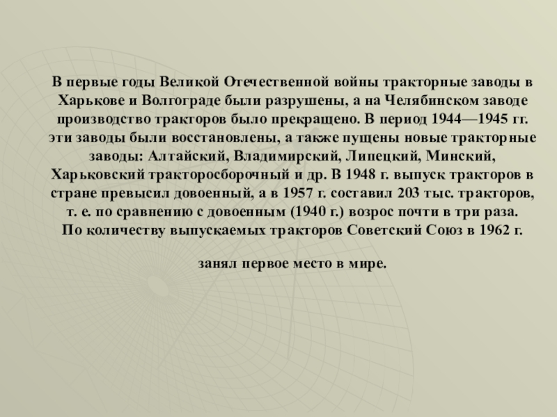 Волгограде были разрушены, а на Челябинском заводе производство тракторов было прекращено. В период 1944—1945 гг. эти заводы были восстановлены, а также пущены новые тракторные заводы: Алтайский, Владимирский, Липецкий, Минский, Харьковский тракторосборочный и др. В 1948 г. выпуск тракторов в стране превысил довоенный, а в 1957 г. составил 203 тыс. тракторов, т. е. по сравнению с довоенным (1940 г.) возрос почти в три раза. По количеству выпускаемых тракторов Советский Союз в 1962 г. занял первое место в мире.