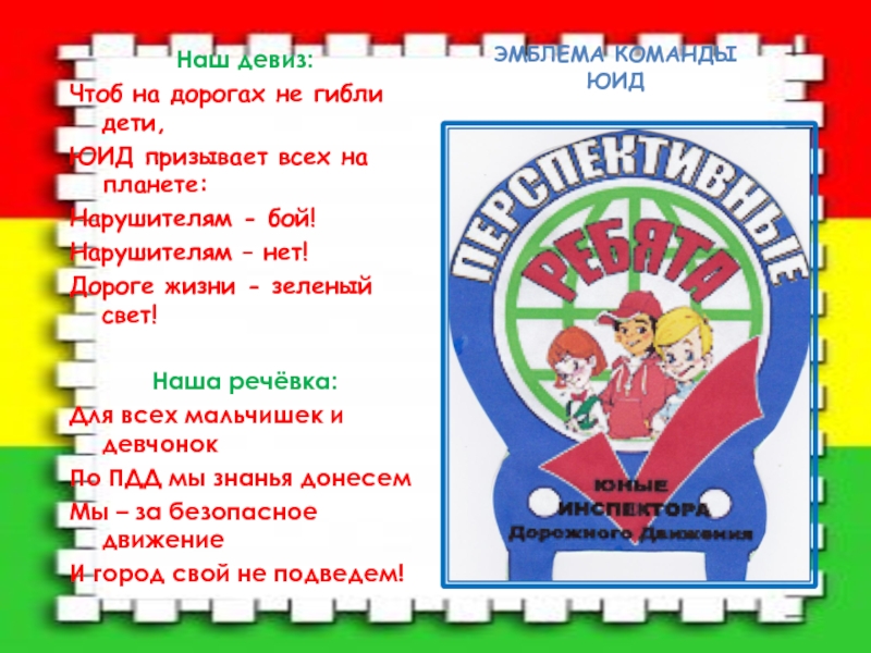ЭМБЛЕМА КОМАНДЫ ЮИД Наш девиз:Чтоб на дорогах не гибли дети,ЮИД призывает всех на планете:Нарушителям - бой!Нарушителям –