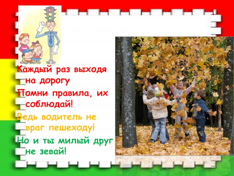 Каждый раз выходя на дорогуПомни правила, их соблюдай!Ведь водитель не враг пешеходу!Но и ты милый друг не