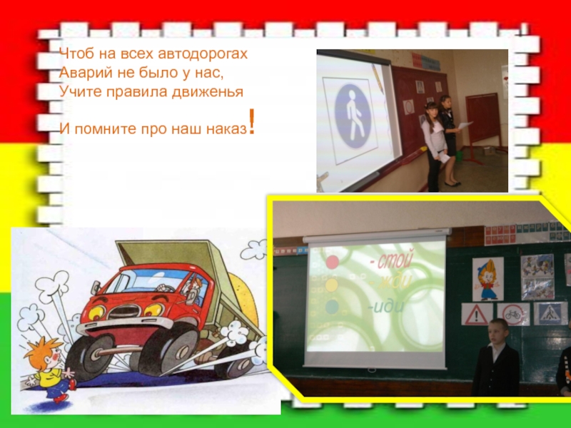 Чтоб на всех автодорогах Аварий не было у нас, Учите правила движенья И помните про наш наказ!