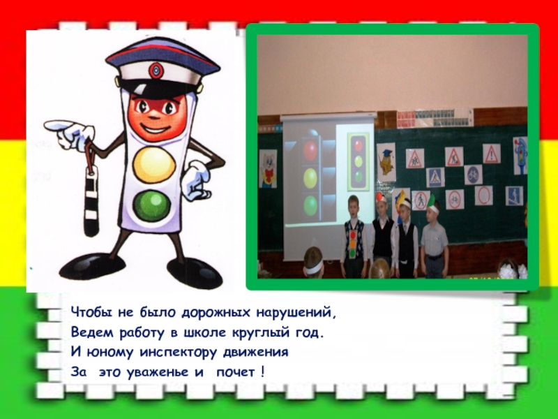 Чтобы не было дорожных нарушений,Ведем работу в школе круглый год.И юному инспектору движенияЗа это уваженье и почет