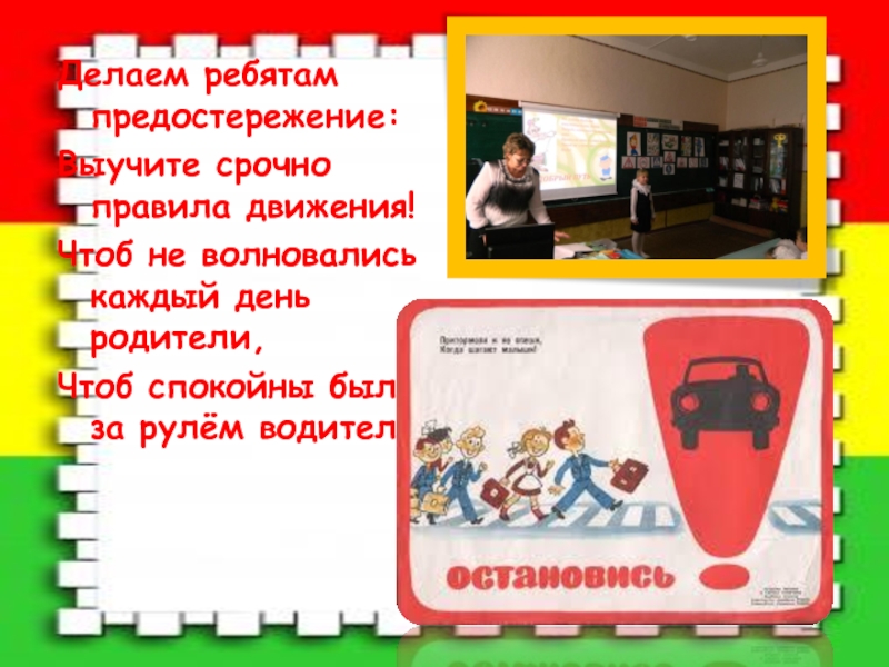 Делаем ребятам предостережение:Выучите срочно правила движения!Чтоб не волновались каждый день родители,Чтоб спокойны были за рулём водители!