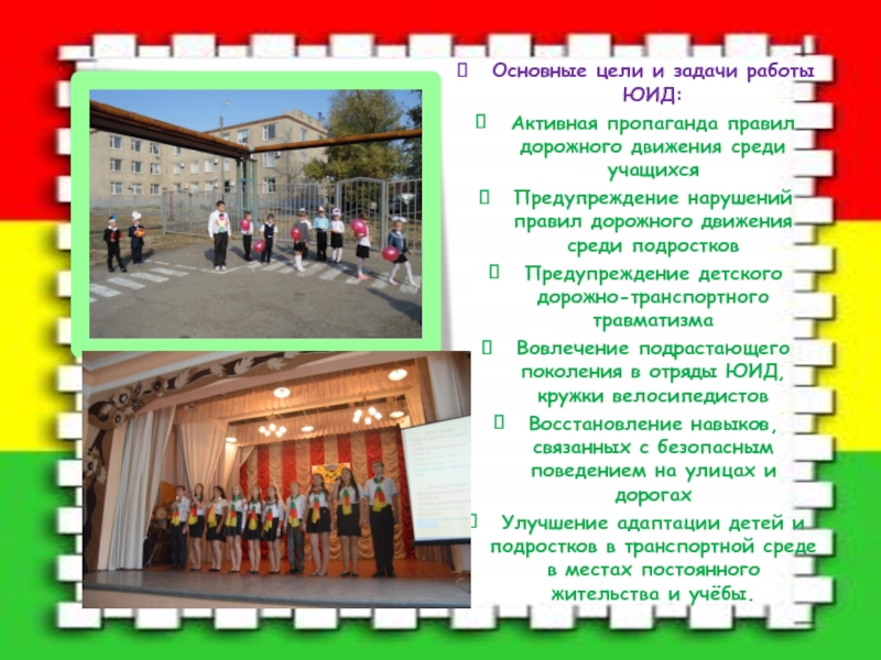Основные цели и задачи работы  ЮИД:Активная пропаганда правил дорожного движения среди учащихся Предупреждение нарушений правил дорожного