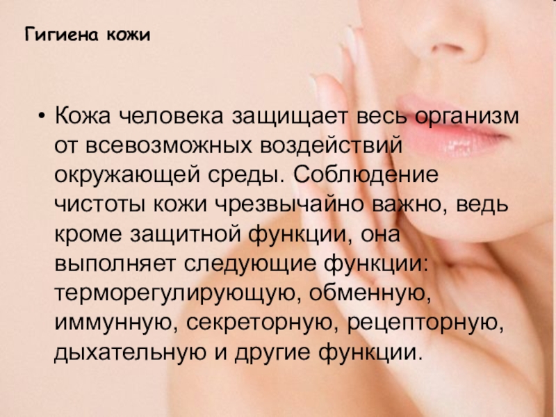 Слайд 6Кожа человека защищает весь организм от всевозможных воздействий окружающей среды. Соблюдение