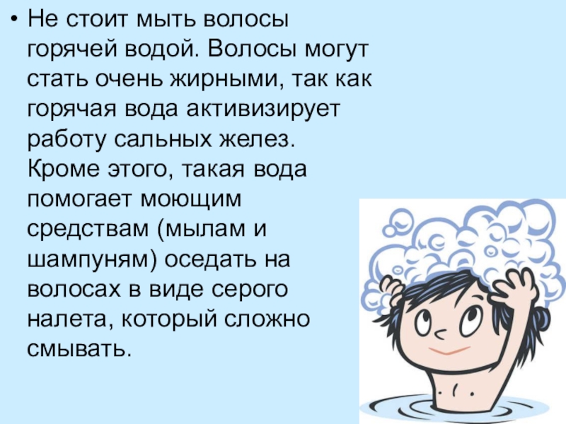 Слайд 12Не стоит мыть волосы горячей водой. Волосы могут стать очень жирными,