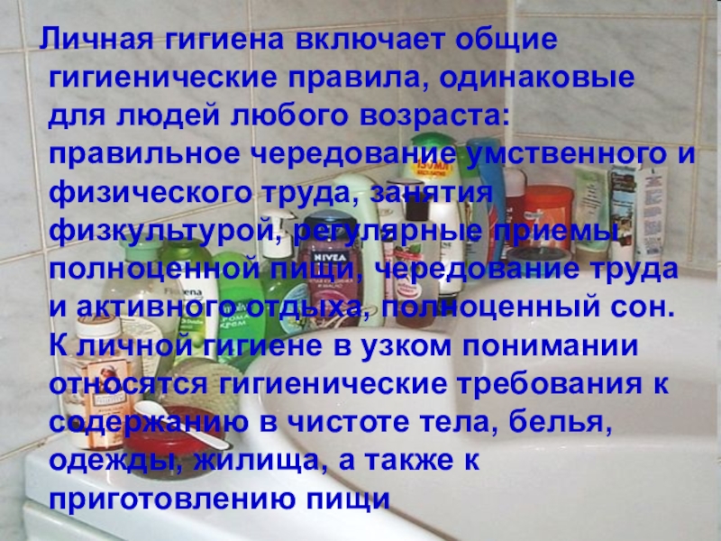 Слайд 4 Личная гигиена включает общие гигиенические правила, одинаковые для людей любого