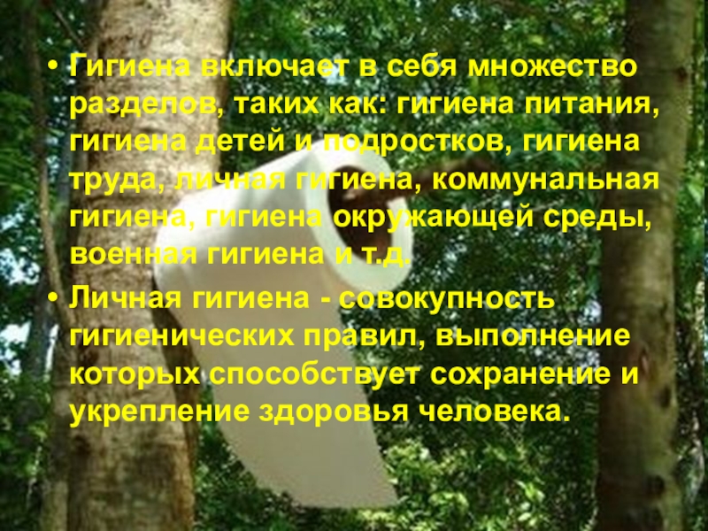 Слайд 3Гигиена включает в себя множество разделов, таких как: гигиена питания, гигиена