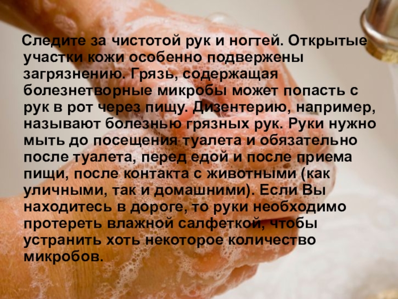 особенно подвержены загрязнению. Грязь, содержащая болезнетворные микробы может попасть с рук в рот через пищу. Дизентерию, например, называют болезнью грязных рук. Руки нужно мыть до посещения туалета и обязательно после туалета, перед едой и после приема пищи, после контакта с животными (как уличными, так и домашними). Если Вы находитесь в дороге, то руки необходимо протереть влажной салфеткой, чтобы устранить хоть некоторое количество микробов.