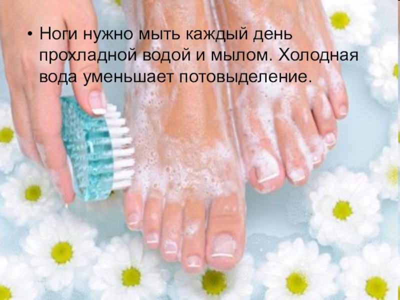 Слайд 9Ноги нужно мыть каждый день прохладной водой и мылом. Холодная вода