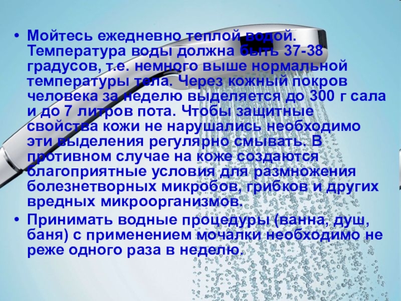 Слайд 7Мойтесь ежедневно теплой водой. Температура воды должна быть 37-38 градусов, т.е.