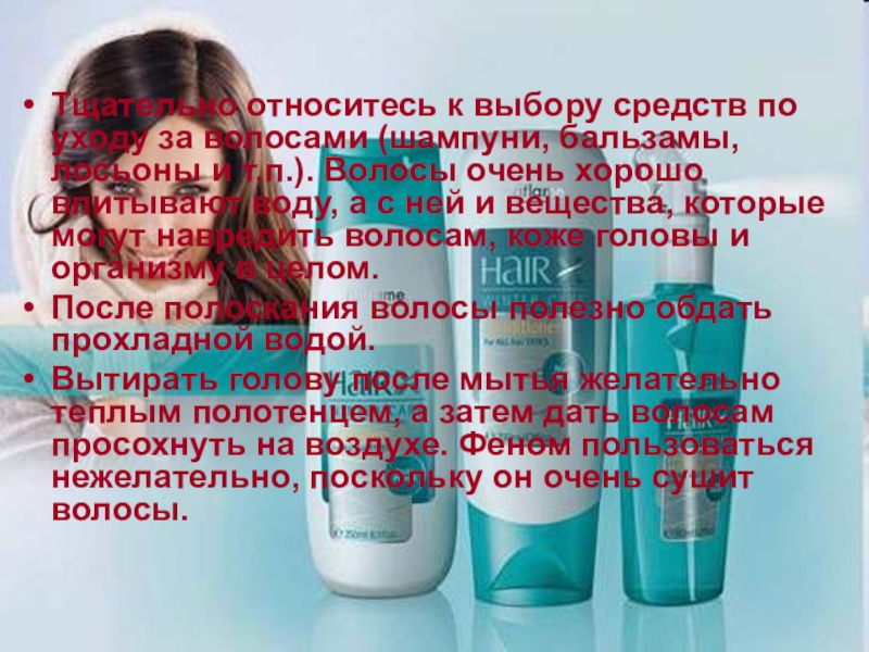 Слайд 13Тщательно относитесь к выбору средств по уходу за волосами (шампуни, бальзамы,