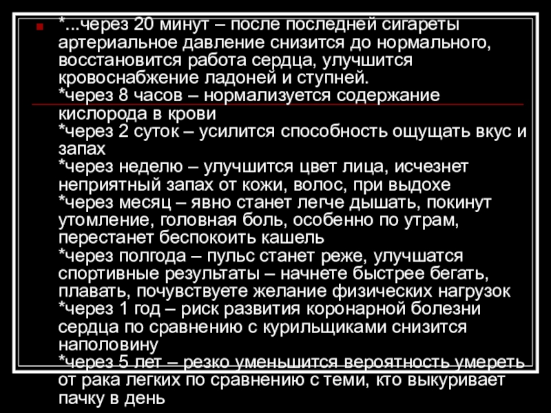 нормального, восстановится работа сердца, улучшится кровоснабжение ладоней и ступней. *через 8 часов – нормализуется содержание кислорода в крови *через 2 суток – усилится способность ощущать вкус и запах *через неделю – улучшится цвет лица, исчезнет неприятный запах от кожи, волос, при выдохе *через месяц – явно станет легче дышать, покинут утомление, головная боль, особенно по утрам, перестанет беспокоить кашель *через полгода – пульс станет реже, улучшатся спортивные результаты – начнете быстрее бегать, плавать, почувствуете желание физических нагрузок *через 1 год – риск развития коронарной болезни сердца по сравнению с курильщиками снизится наполовину *через 5 лет – резко уменьшится вероятность умереть от рака легких по сравнению с теми, кто выкуривает пачку в день