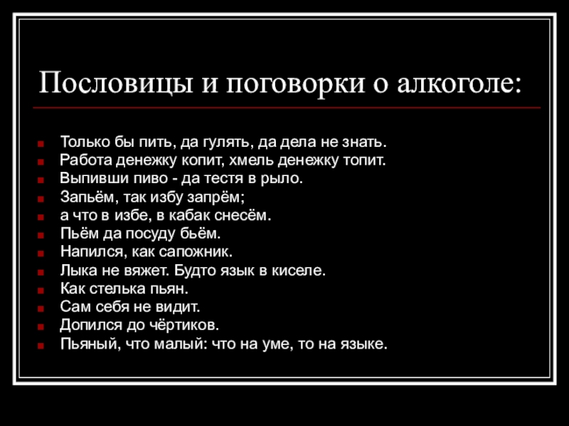 Пословицы и поговорки о алкоголе:Только бы пить, да гулять, да дела не знать.Работа денежку копит, хмель денежку