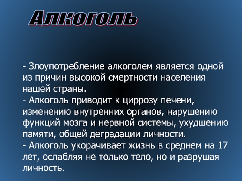 Алкоголь - Злоупотребление алкоголем является одной из причин высокой смертности населения нашей страны. - Алкоголь приводит к