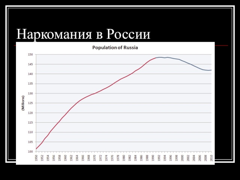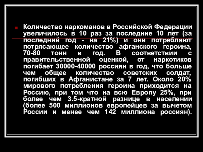 10 лет (за последний год - на 21%) и они потребляют потрясающее количество афганского героина, 70-80 тонн в год. В соответствии с правительственной оценкой, от наркотиков погибает 30000-40000 россиян в год, что больше чем общее количество советских солдат, погибших в Афганистане за 7 лет. Около 20% мирового потребления героина приходится на Россию, при том что на всю Европу 25%, при более чем 3.5-кратной разнице в населении (более 500 миллионов европейцев за вычетом России и менее чем 142 миллиона россиян).