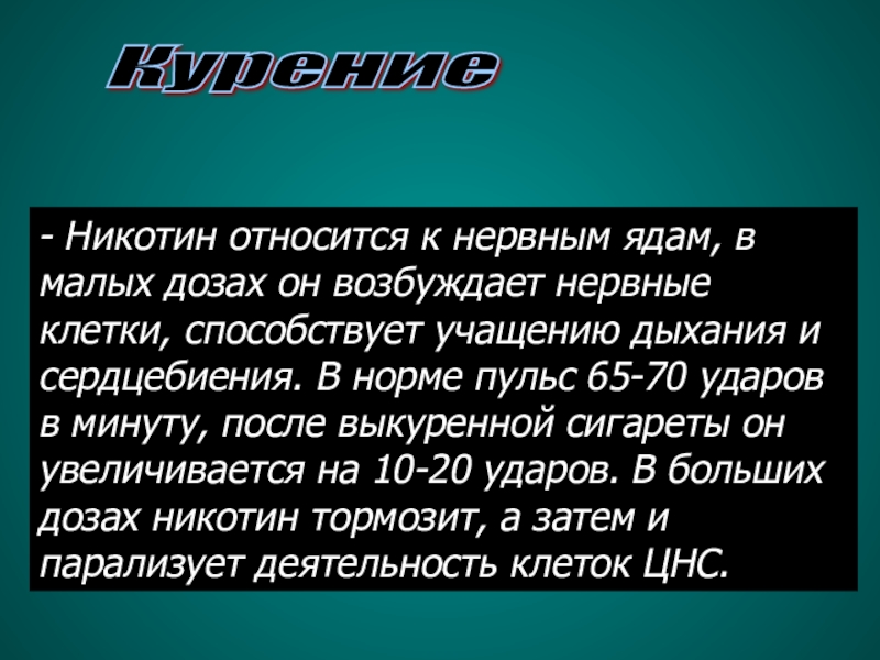 Курение - Никотин относится к нервным ядам, в малых дозах он возбуждает нервные клетки, способствует учащению дыхания