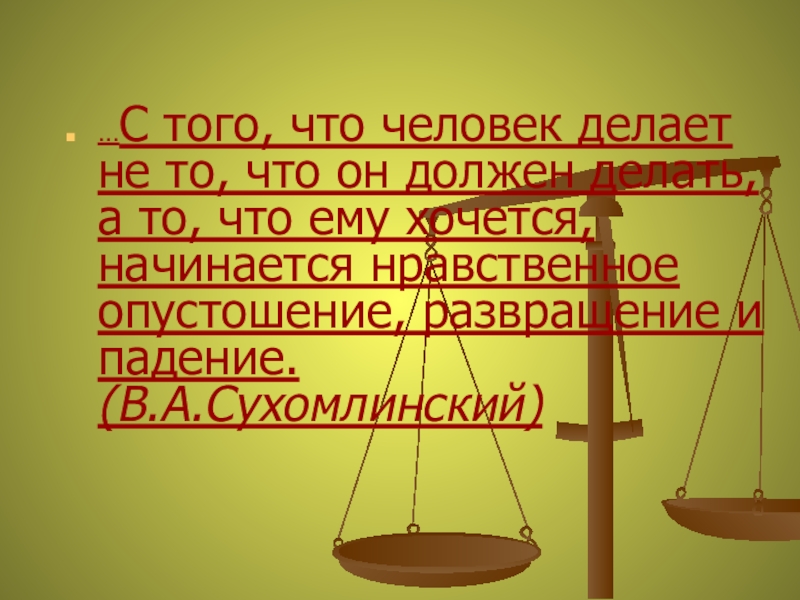 …С того, что человек делает не то, что он должен делать, а то, что ему хочется, начинается нравственное опустошение, развращение и падение. (В.А.Сухомлинский)