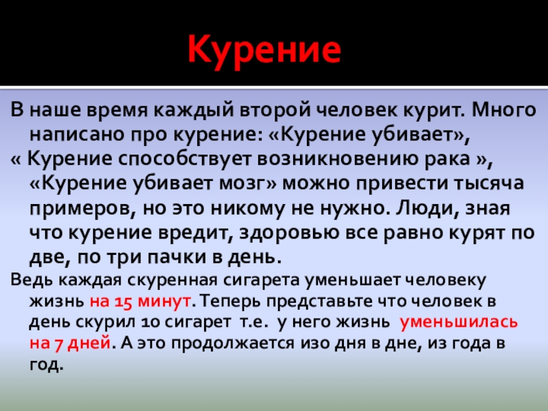 В наше время каждый второй человек курит. Много написано про курение: «Курение убивает»,