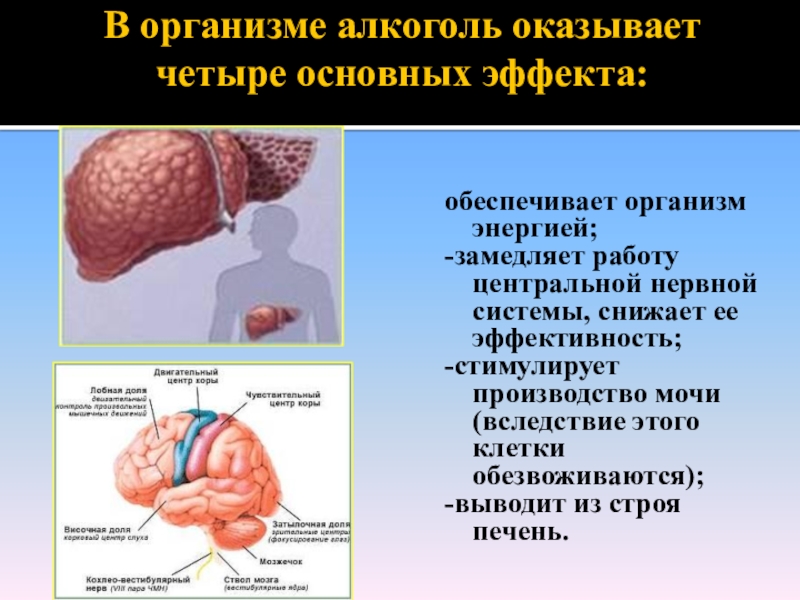 Слайд 25В организме алкоголь оказывает четыре основных эффекта: