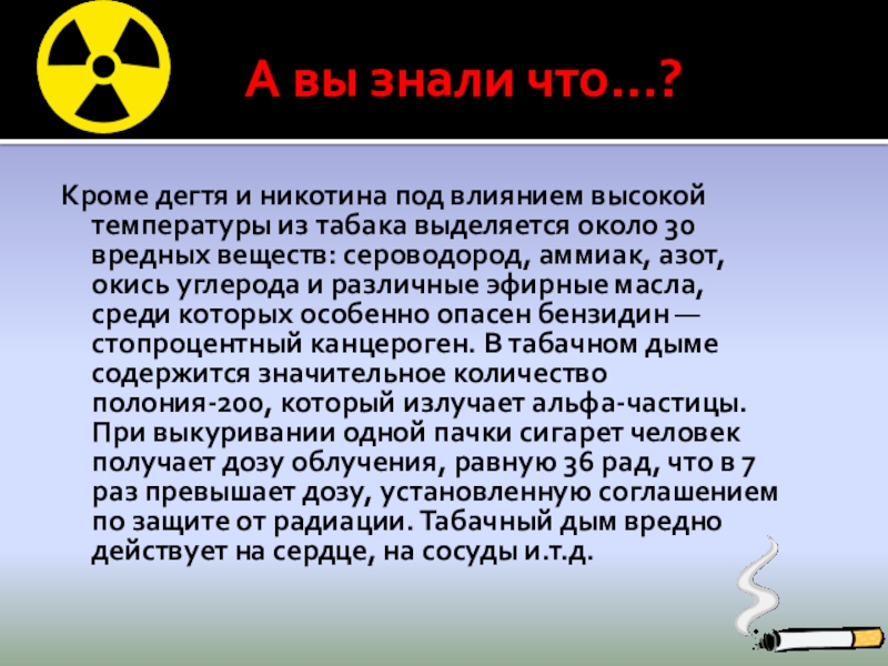 Кроме дегтя и никотина под влиянием высокой температуры из табака выделяется около 30 вредных веществ: сероводород, аммиак, азот, окись углерода и различные эфирные масла, среди которых особенно опасен бензидин — стопроцентный канцероген. В табачном дыме содержится значительное количество полония-200, который излучает альфа-частицы. При выкуривании одной пачки сигарет человек получает дозу облучения, равную 36 рад, что в 7 раз превышает дозу, установленную соглашением по защите от радиации. Табачный дым вредно действует на сердце, на сосуды и.т.д.
