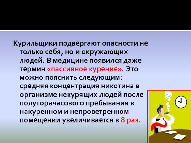 медицине появился даже термин «пассивное курение». Это можно пояснить следующим: средняя концентрация никотина в организме некурящих людей после полуторачасового пребывания в накуренном и непроветренном помещении увеличивается в 8 раз.