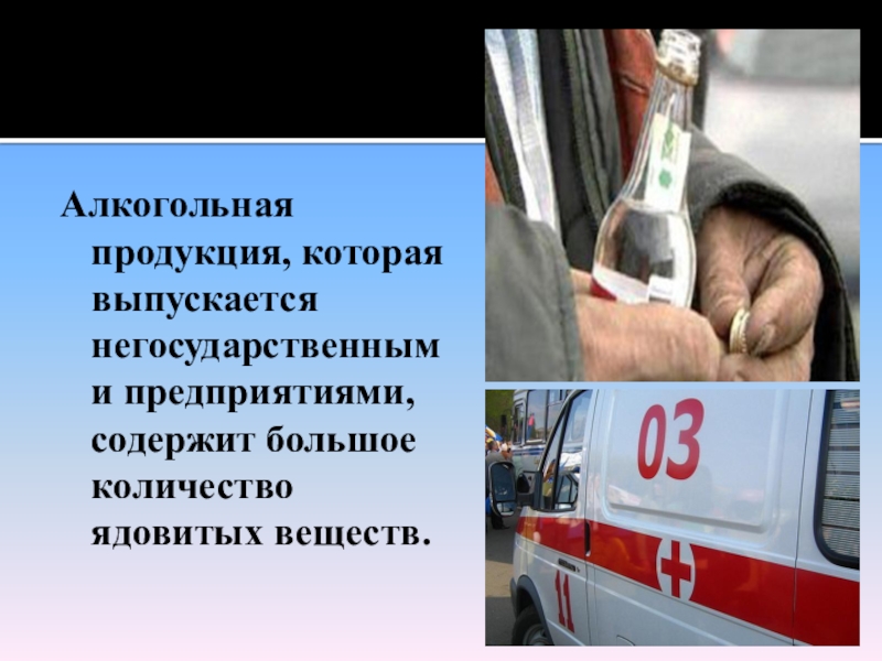 Слайд 20Алкогольная продукция, которая выпускается негосударственными предприятиями, содержит большое количество ядовитых веществ.