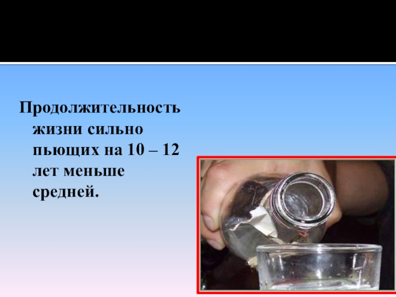 Слайд 27Продолжительность жизни сильно пьющих на 10 – 12 лет меньше средней.
